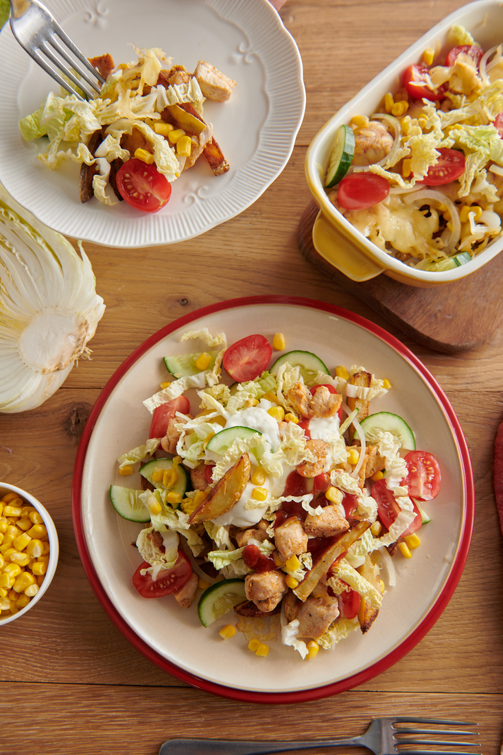 Gril nog 5 minuten in de oven tot de kaas is gesmolten. Serveer met ijsbergsla en knoflooksaus eroverheen.